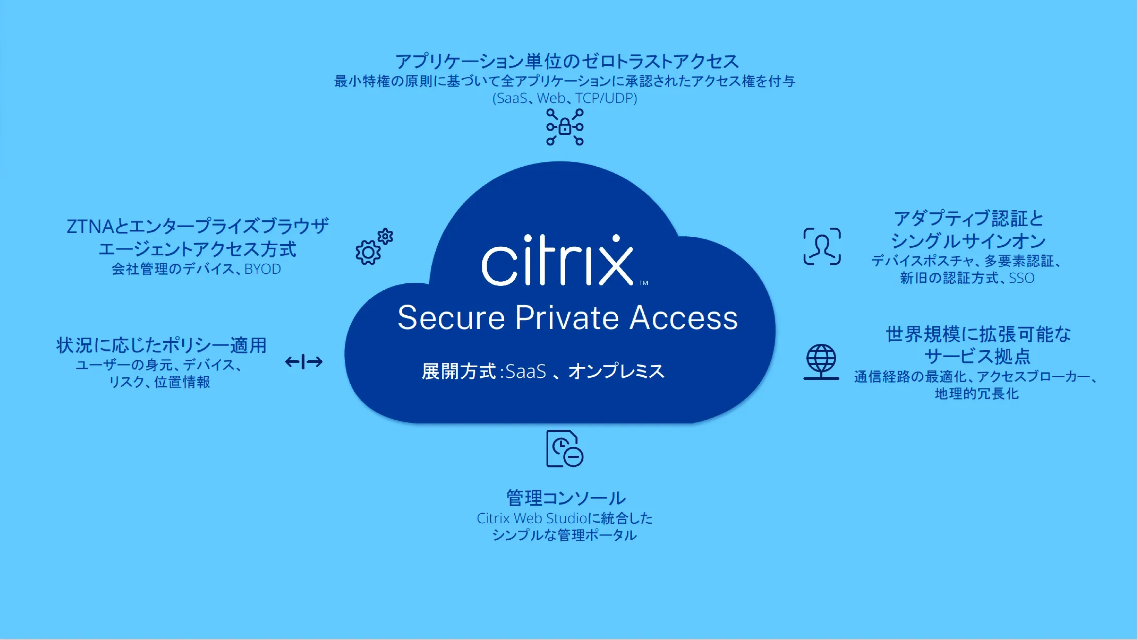 包括的なZTNAソリューションであるCitrix Secure Private Accessは、ハイブリッド環境におけるアプリケーションやデータへの安全でアイデンティティに基づいたアクセスを提供します。デフォルトで拒否する最小特権の原則に基づいたゼロトラストの原則により、アクセスを継続的に検証され、コンテキスト(アクセス状況)に応じたアクセス権を提供することで、不正アクセスやデータ侵害のリスクを低減します。